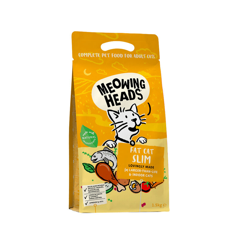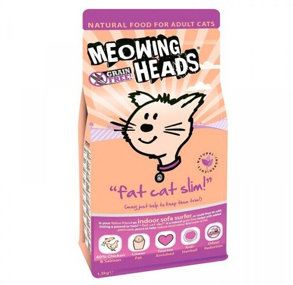 Купить Корм Meowing Heads Fat Cat Slim Худеющий толстячок для кошек с избыточным весом, с курицей и лососем, 1.5 кг