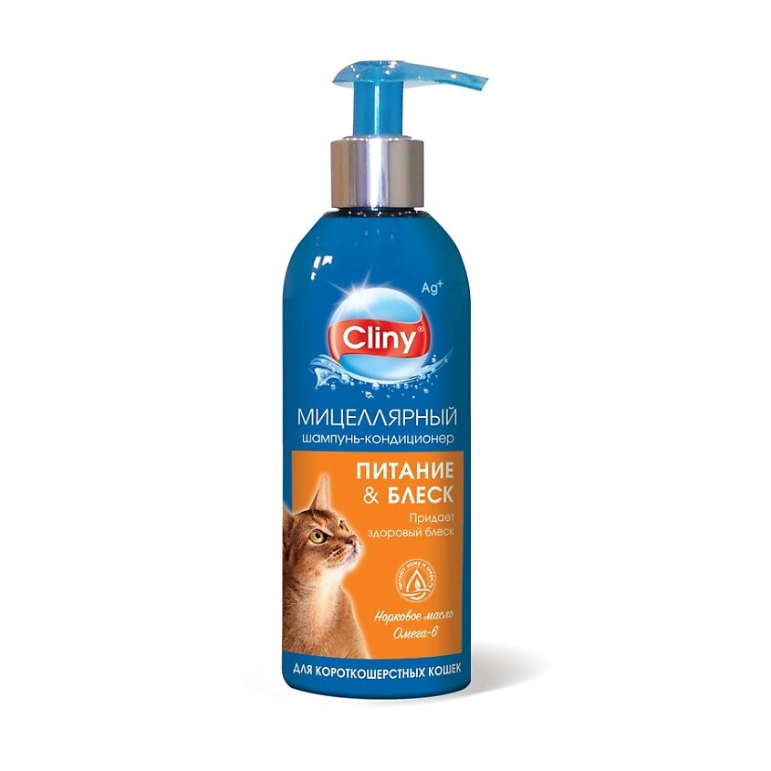 Cliny Питание и блеск мицеллярный шампунь кондиционер для короткошерстных кошек (200 мл)