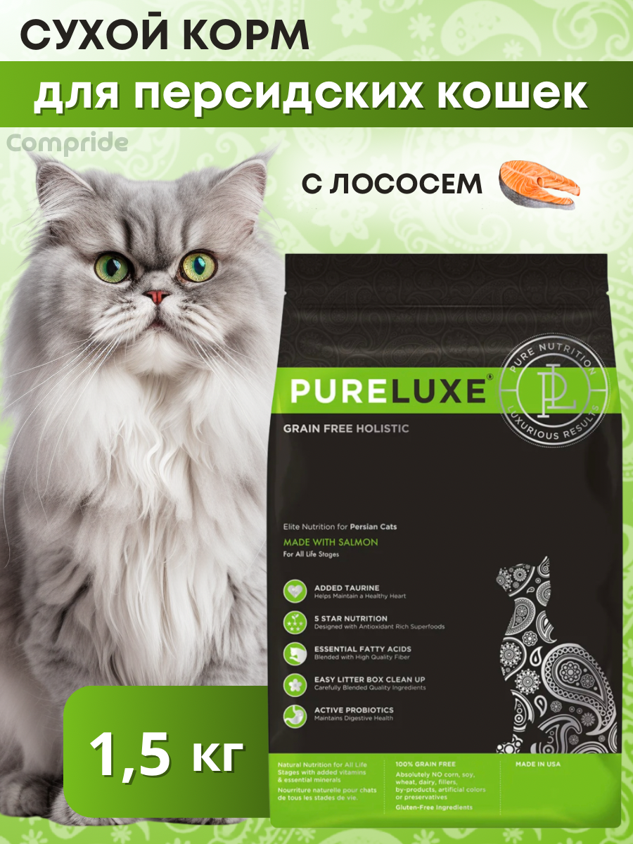 Купить Сухой корм для кошек PureLuxe породы Персидская, беззерновой, с лососем 1.5 кг