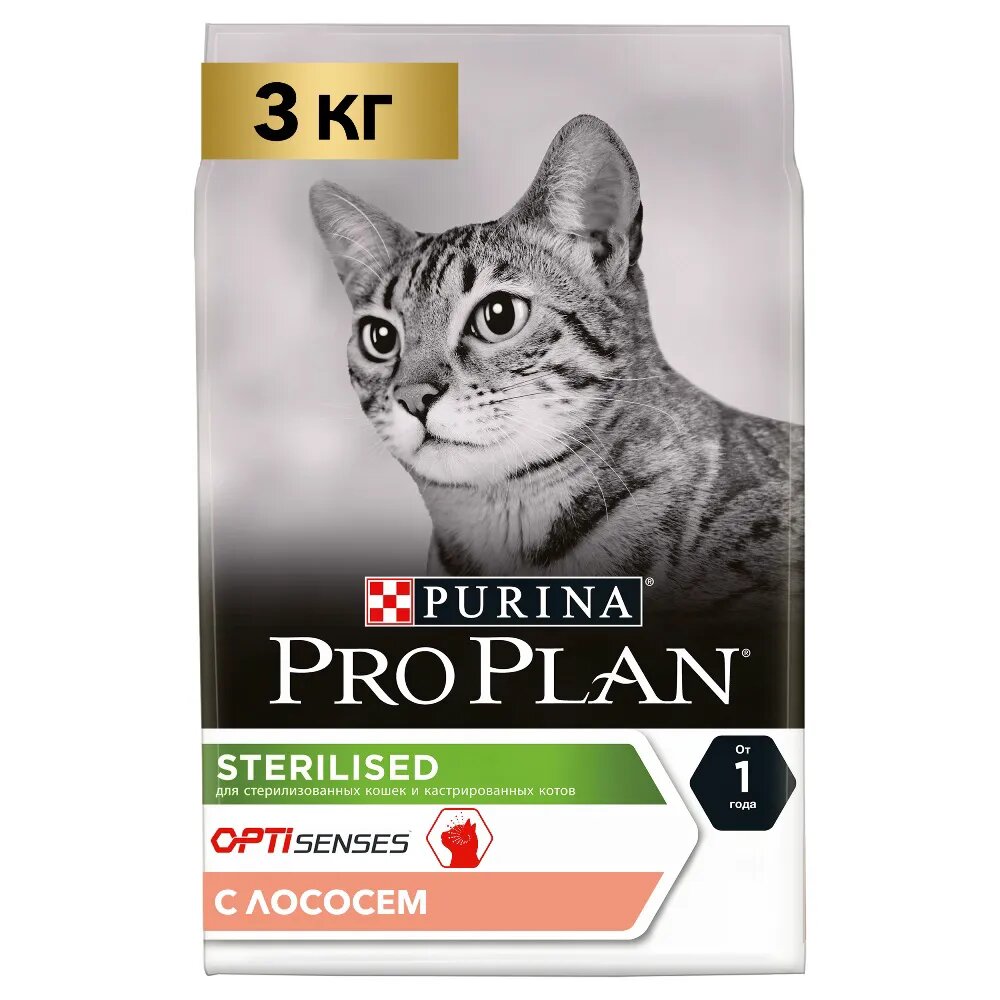 PRO PLAN 3 кг сухой корм для взрослых стерилизованных кошек и кастрированных котов, для поддержания органов чувств, с высоким содержанием лосося