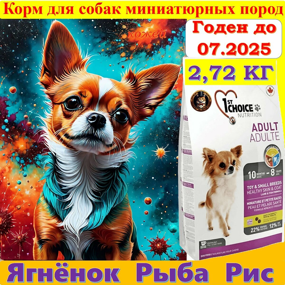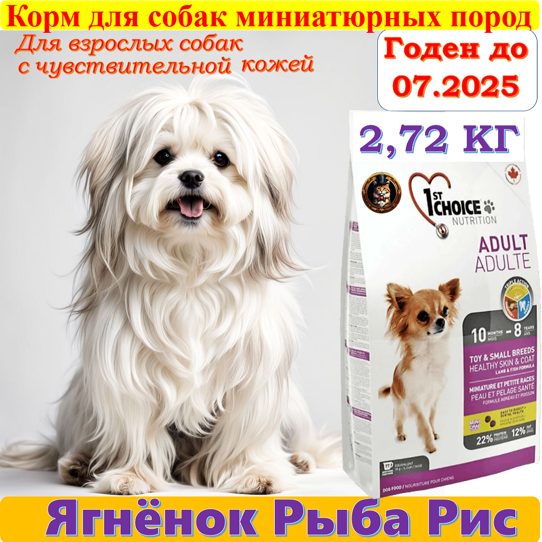 Сухой корм 1ST CHOICE ADULT TOY&SMALL для взрослых собак малых пород с чувствительной кожей и шерстью (ягненок, рыба,рис), 2,72 кг