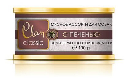 Корм полнорационный консервированный Clan CLASSIC для собак, Мясное ассорти с печенью, 100г, 24 шт.