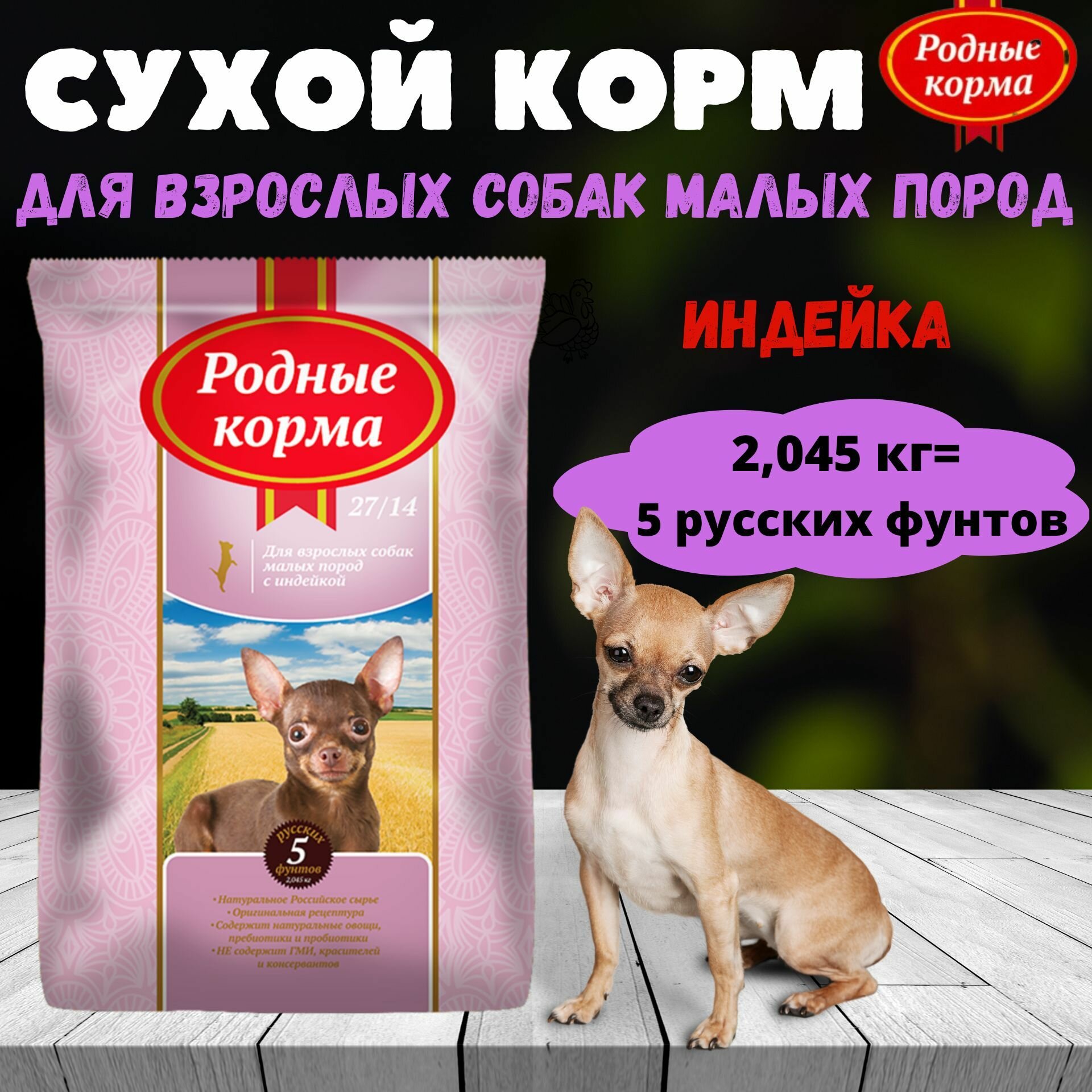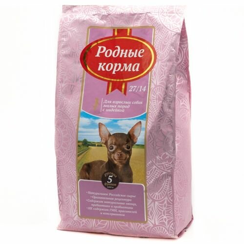 Корм сухой родные корма 27/14 5 русских фунтов для взрослых собак мелких пород, с индейкой 2,045 кг
