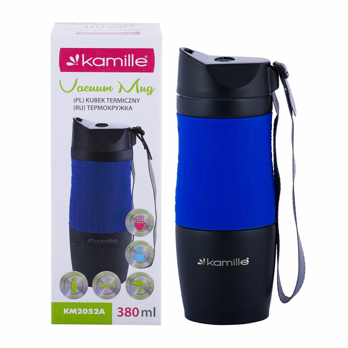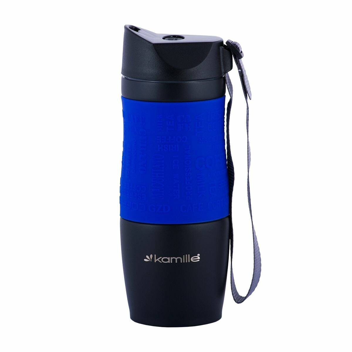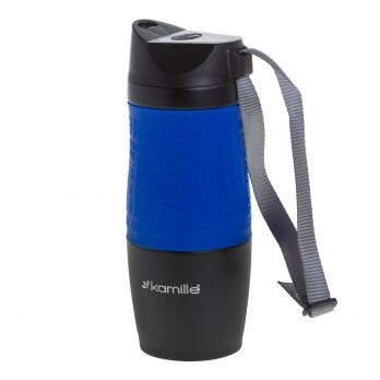 Купить Термокружка Kamille с TPR-вставкой и ремешком (синяя) 380 мл (2052A)