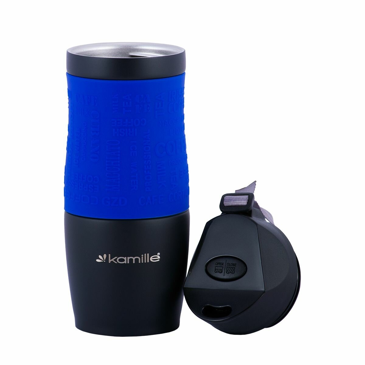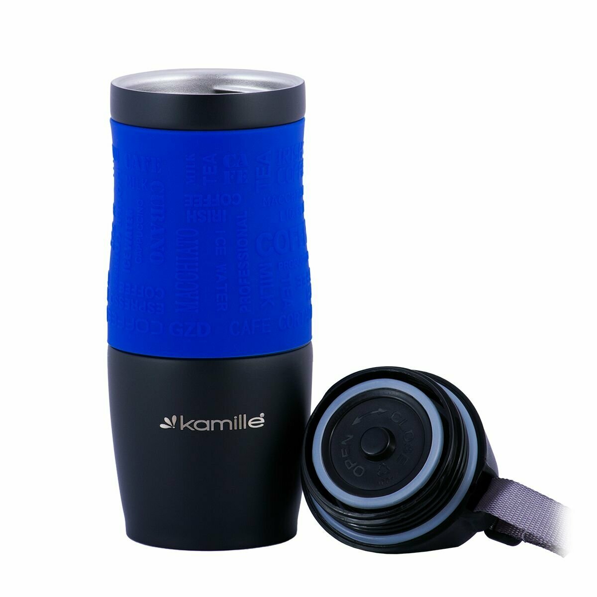 Термокружка 380 мл. из нержавеющей стали Kamille KM 2052A с TPR-вставкой и ремешком (2052A / синий)