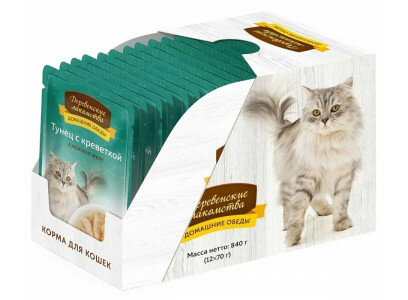 Деревенские лакомства домашние обеды для взрослых кошек с тунцом и креветкой в нежном желе 70 гр (70 гр х 12 шт)