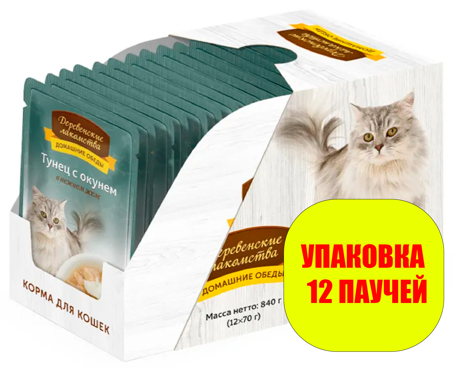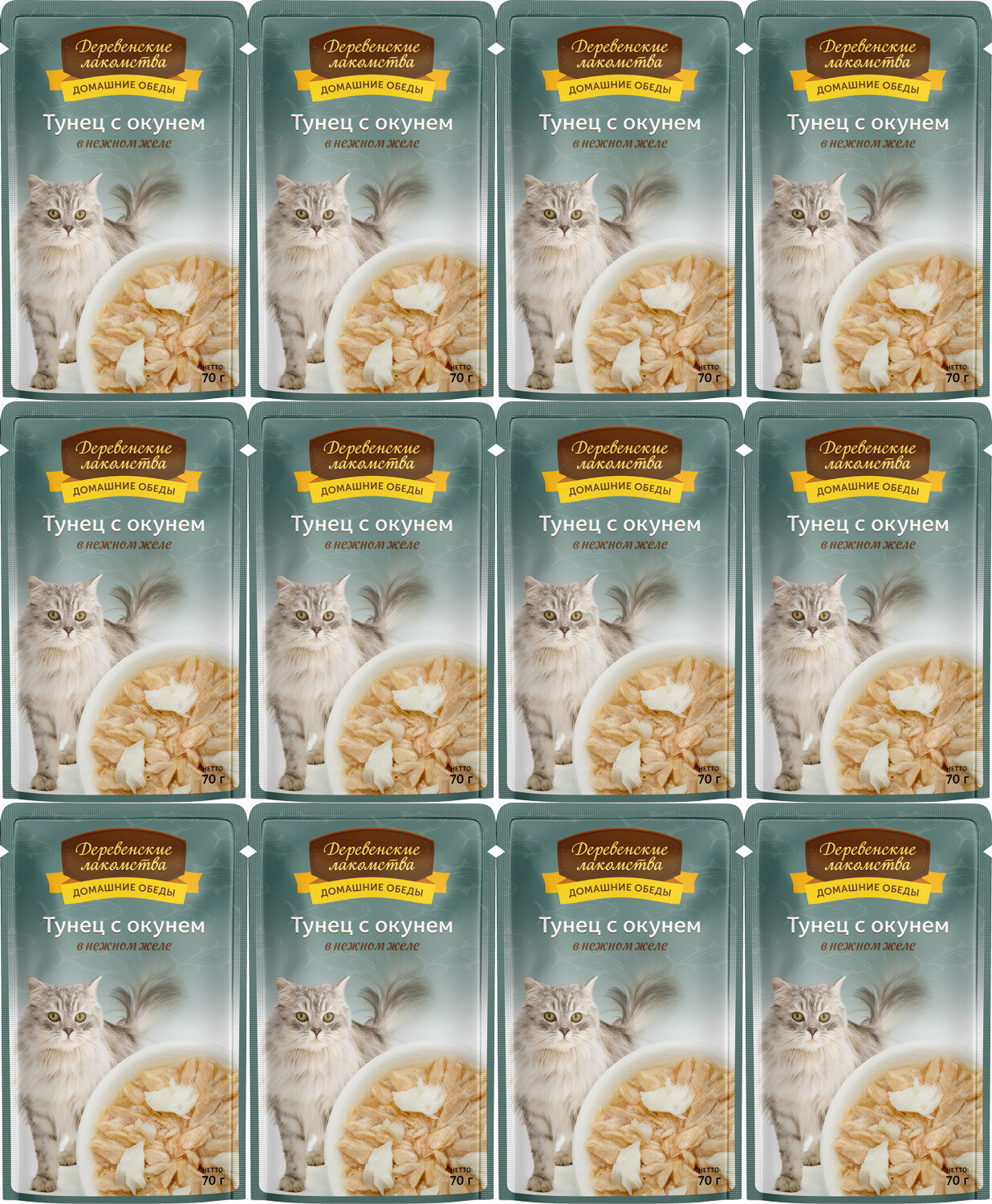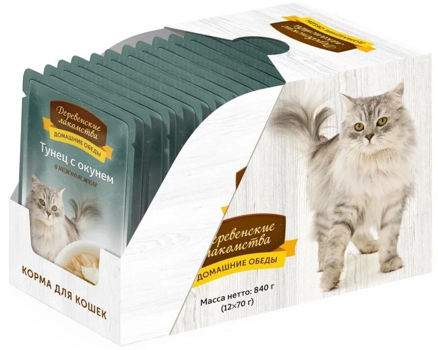 Деревенские лакомства корм для кошек Домашние обеды, беззерновой, с тунцом, с окунем 12*70 г (кусочки в желе)