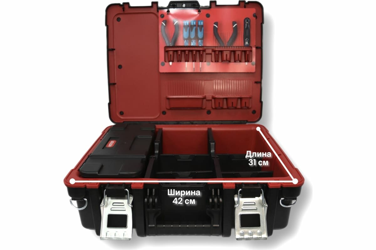 | Плюсы: | Очень удобный кейс для хранения и транспортировки инструментов электрика и возможно других. Герметичен, есть съемные перегородки, с внутренней стороны крышки крепления разного размера для хранения отверток и разных кусачек, плоскогубцев. Есть органайзер для мелочей. Замки металлические. Подходят маленькие пластиковые контейнеры- боксы для мелочей из Леруа Мерлена за 28?. Видел такой кейс под разными марками, раньше продавался в Кастораме по маркой MacAlister и дешевле на около 1000?. Храню в нем все инструменты для работы с электрикой(зачистка кабеля, обжим наконечников, отвертки диэлектрические, плоскогубцы, кабелерезы, кусачки, наконечники НШВИ, контакты WAGO, стяжки и др. Всё в одном месте- очень удобно. |