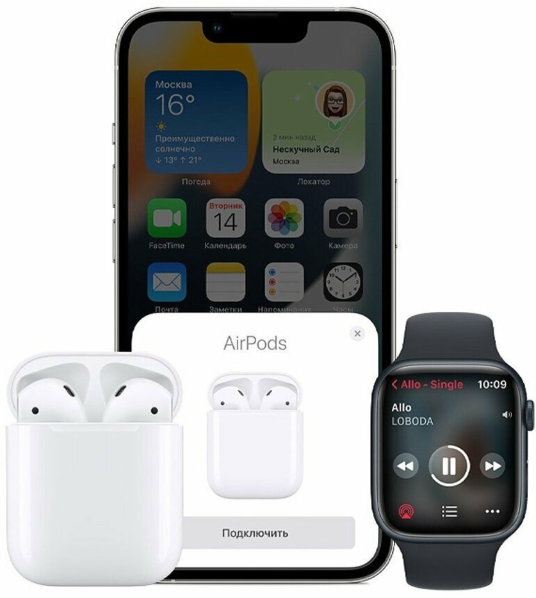 | Комплектация | наушники AirPods, зарядный футляр MagSafe, кабель Lightning/USB‑С, документация |