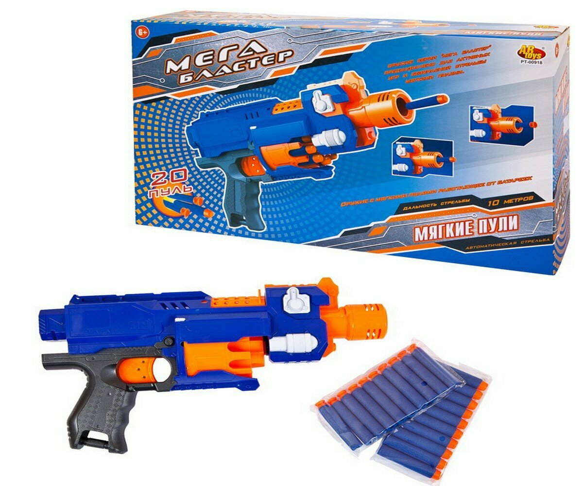 Бластер абтойс мегабластер с 20 мягкими пулями синий в/к pt-00918
