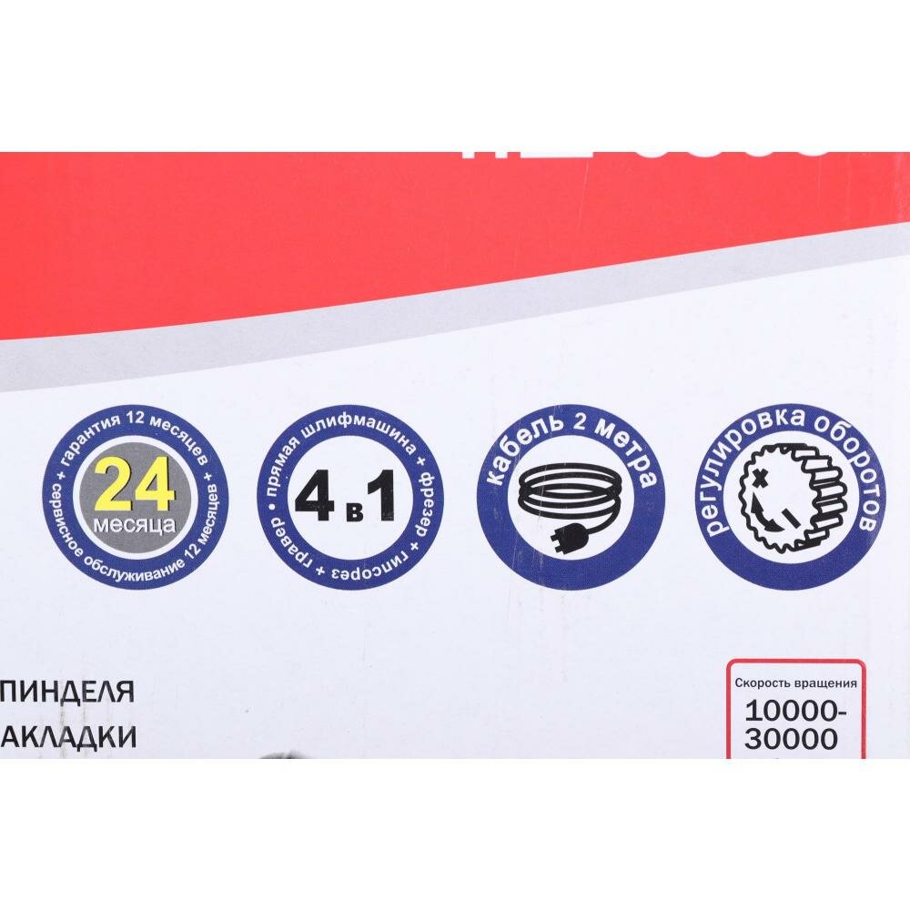 | Комплектация | набор фрез, гибкий вал, насадка для вертикального фрезерования, насадка-гипсорез, циркуль, дополнительная рукоятка, параллельный упор, цанги 2шт., ключи |