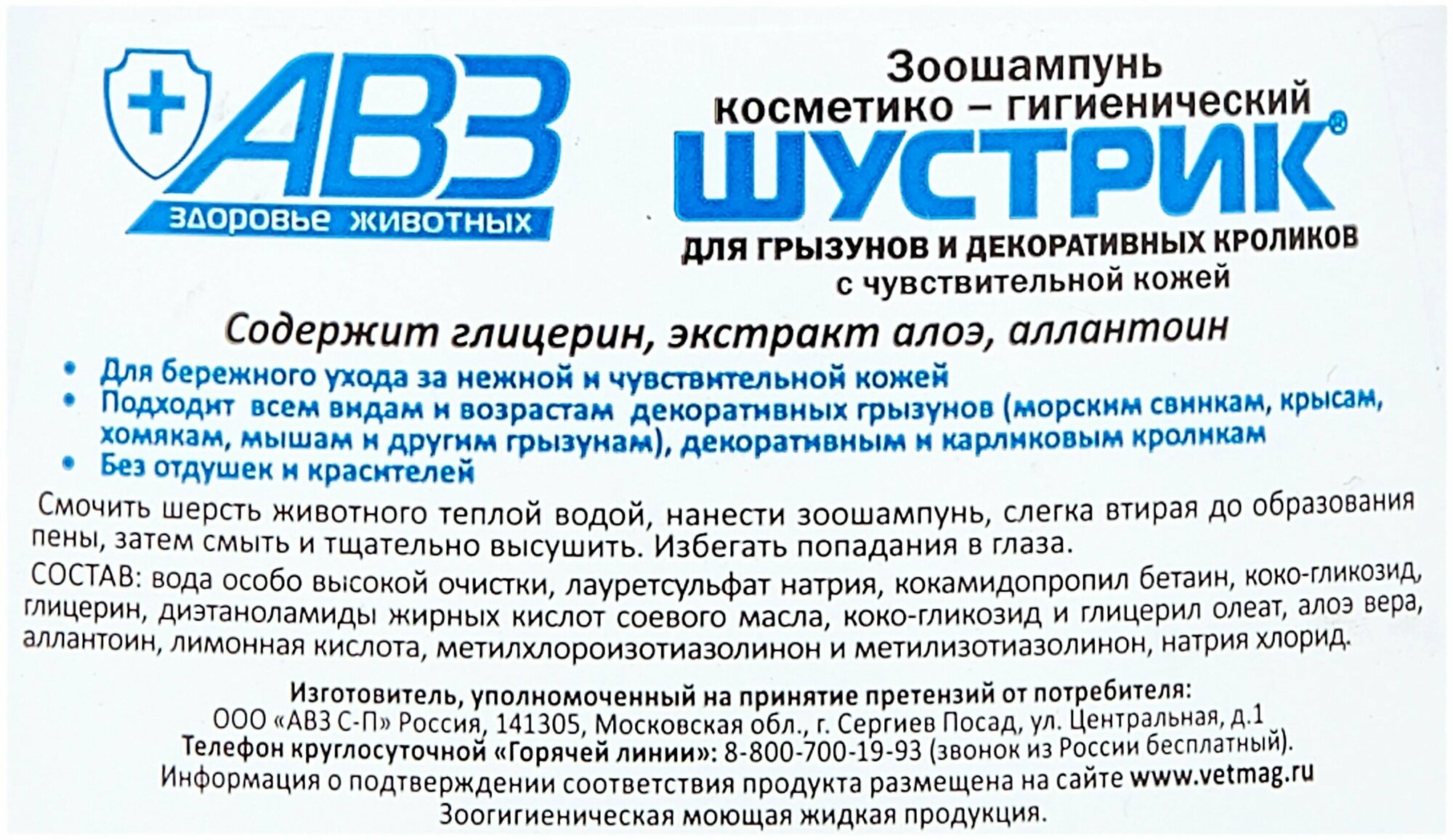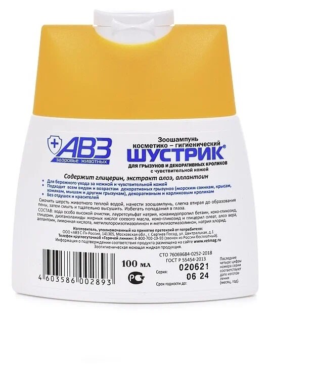 СохранитьШампунь шустрик для грызунов с чувствительной кожей, 100 мл АВЗ 100г интересное: