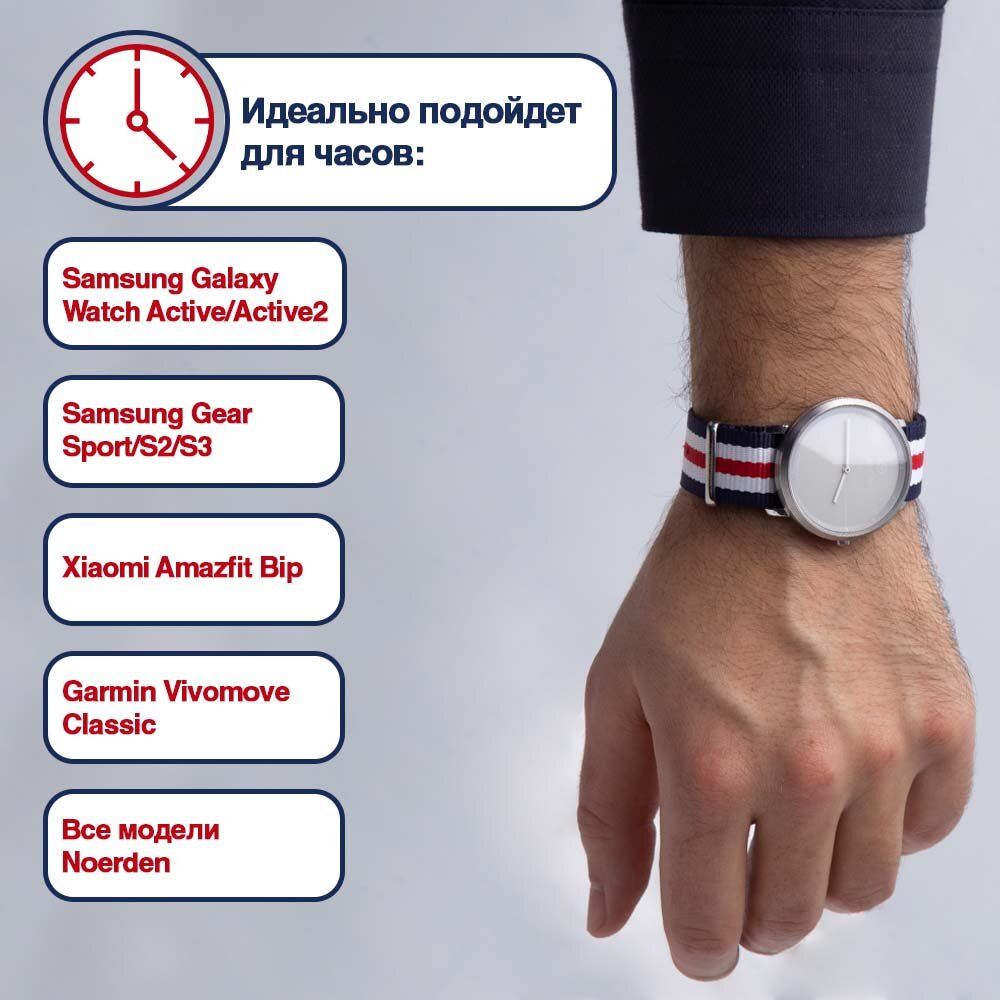 Ремешок для умных смарт часов и фитнес браслетов 20 мм Noerden, Samsung Galaxy Watch, Samsung Gear Sport, Xiaomi Amazfit Bip, Garmin Vivomove Classic, нейлоновый, расцветка НАТО (красный/белый/синий) интересное: