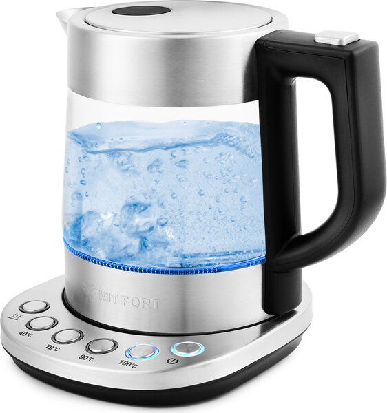 Чайник KITFORT КТ-648, 1 л, 2200 Вт, закрытый нагревательный элемент, терморегулятор, стекло, серебристый