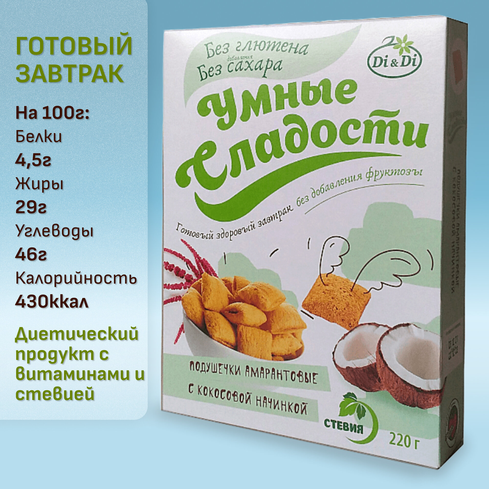 Подушечки амарантовые Умные Сладости с кокосовой начинкой, 220 гр ( без сахара и без глютена) / полезные сладости / безглютеновые подушечки