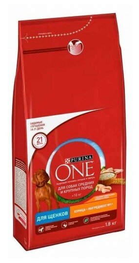 PURINA ONE 1,8 кг сухой корм для щенков средних и крупных пород, с высоким содержанием курицы и с рисом 1 шт