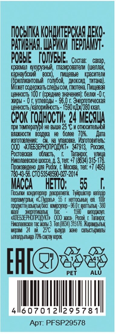 Посыпки шарики голубые перламутровые С.Пудовъ, 55 г интересное: