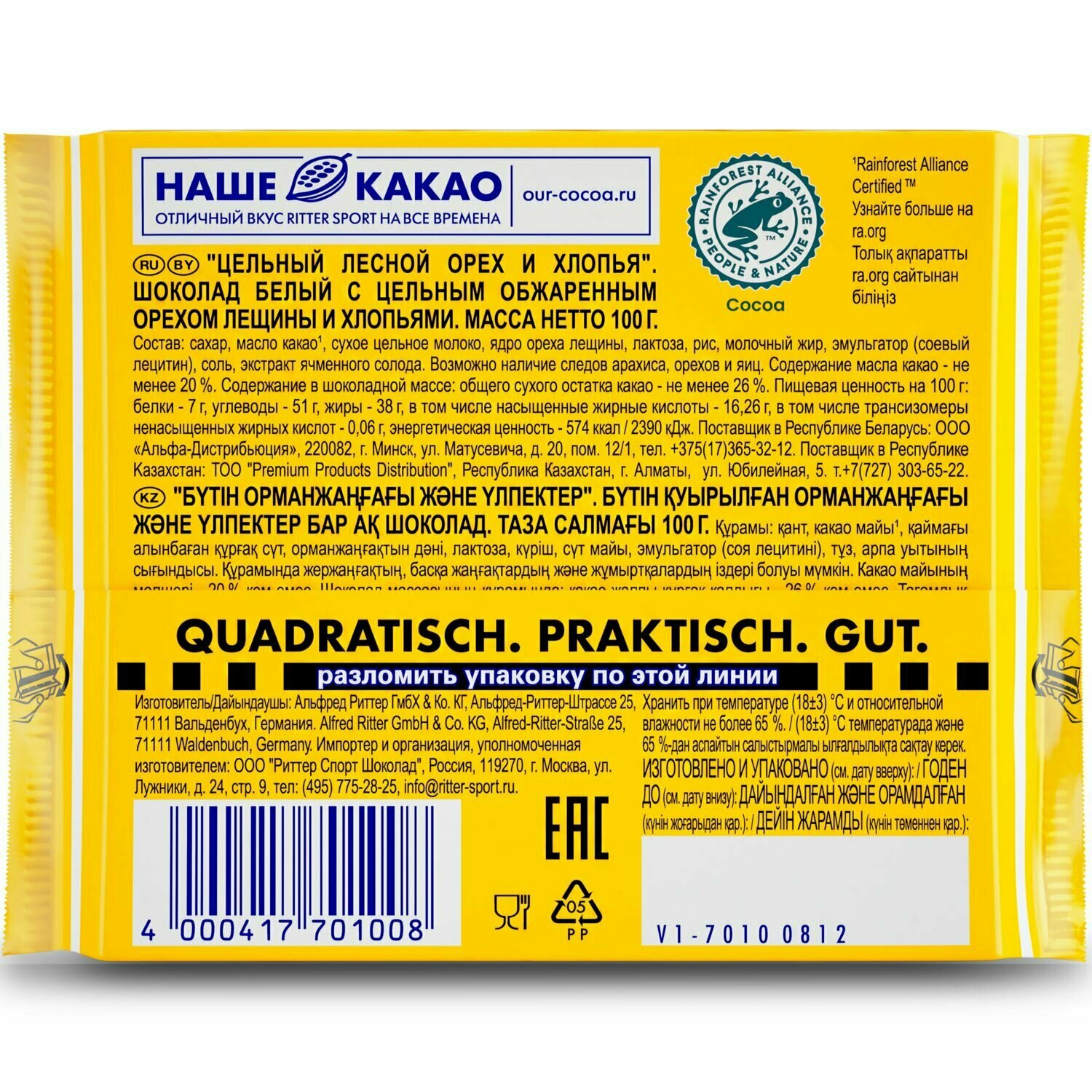 Шоколад белый RITTER SPORT Цельный лесной орех и хлопья, 100г