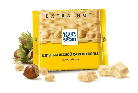 Шоколад Ritter Sport Extra Nut белый цельный лесной орех и хлопья, 100 г