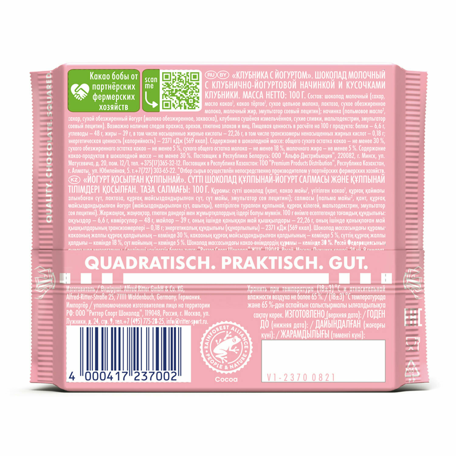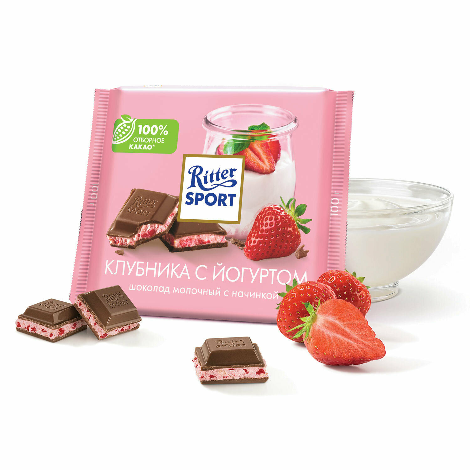 Шоколад RITTER SPORT "Клубника с йогуртом", молочный с начинкой, 100 г, Германия, RU2376