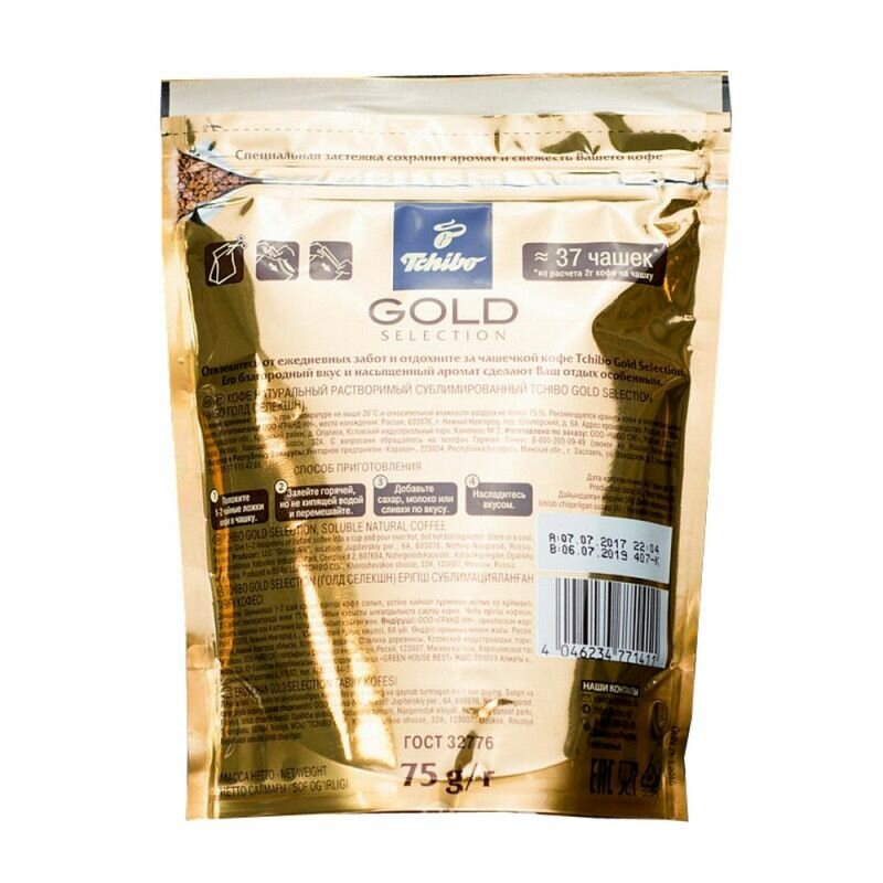 Ниже Вы можете прочитать отзывы на Кофе растворимый Tchibo Gold Selection, пакет, 75 г, ознакомится с подробными характеристиками, посмотреть интересные обзоры и фотографии на Кофе растворимый Tchibo Gold Selection, пакет, 75 г.