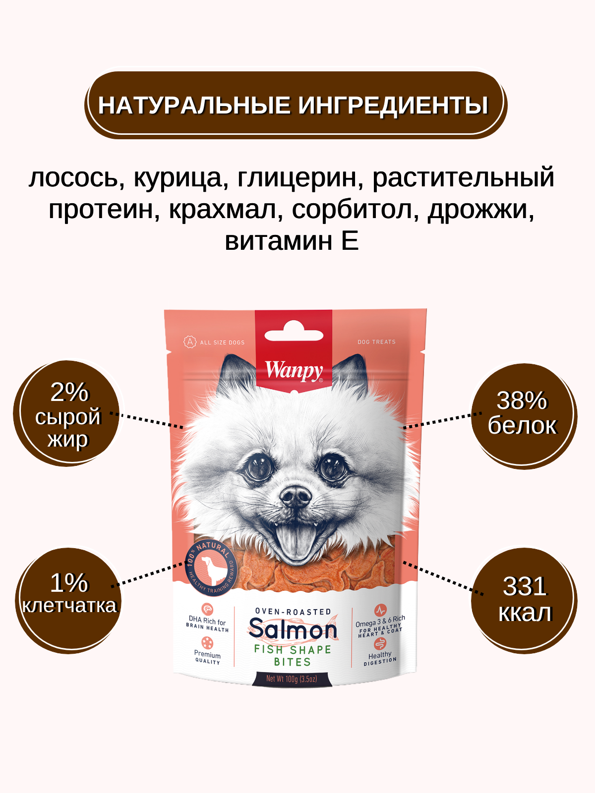 Лакомства для собак Wanpy / Ванпи Дог кусочки из нежного лосося в форме рыбок 100г / снеки для собак / жевательные косточки / лакомство для животных