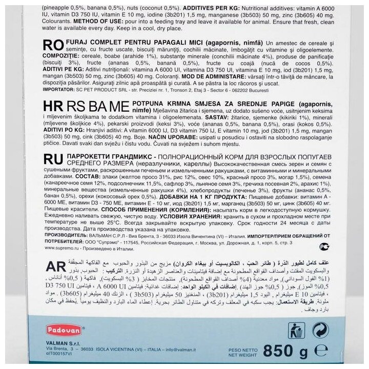 PADOVAN Корм GRANDMIX PARROCCHETTI комплексный для средних попугаев 850г