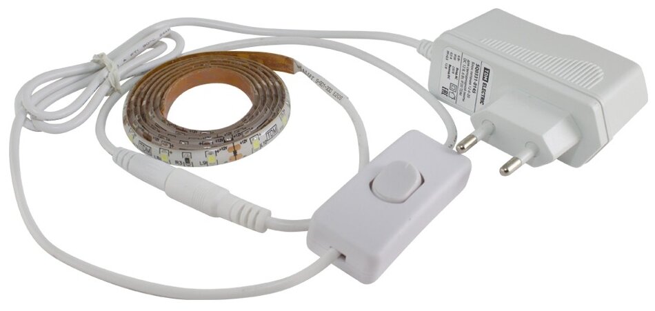 В комплекте с лентой светодиодов и блок питания и выключатель, включил в розетку и пользуйся. Удобно встроить в тёмный шкаф. Светит ярко. Прислали очень быстро |