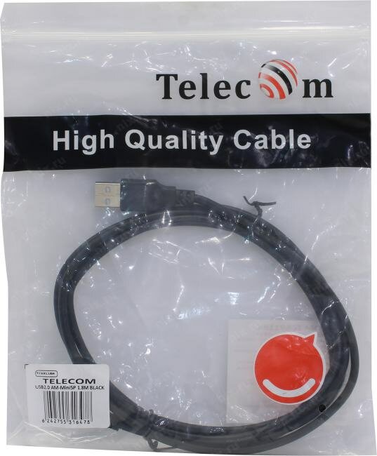 Кабель USB 2.0 A-->mini-B 5P (1,8м) чёрный, Telecom