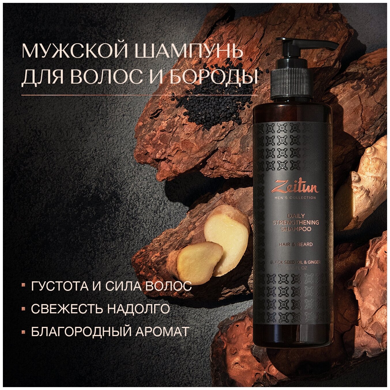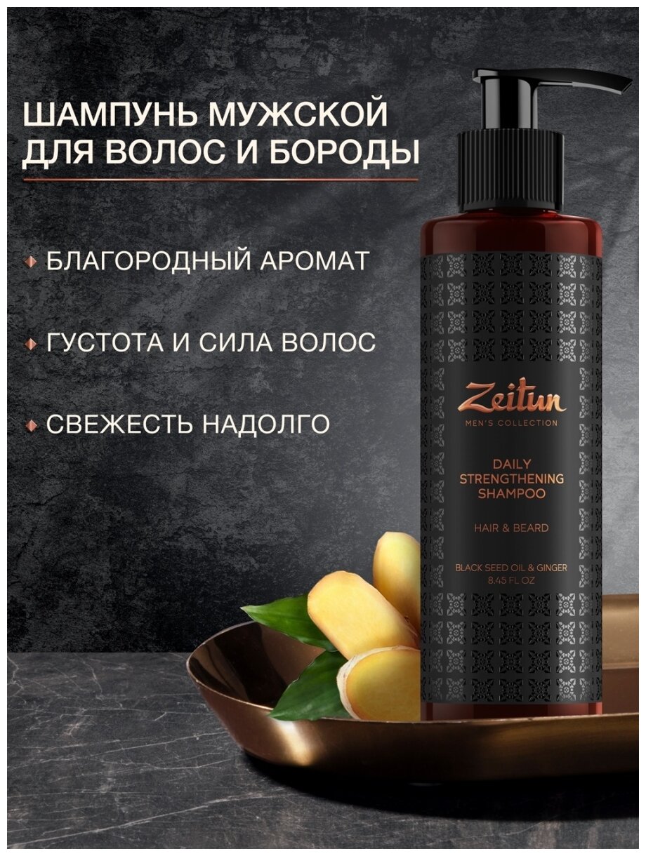 Zeitun Шампунь для волос и бороды мужской, против выпадения и перхоти, укрепляющий, с имбирем и черным тмином, 250 г, 250 мл