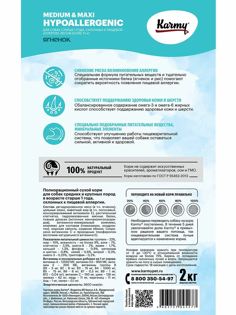 Корм сухой для собак средних и крупных пород Karmy гипоаллергенный, ягненок, 2 кг