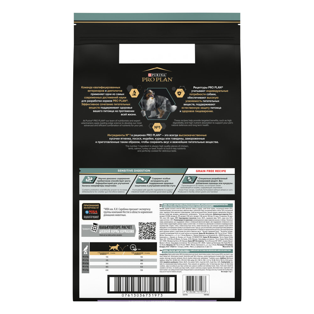 Сухой корм Pro Plan беззерновой для взрослых собак средних и крупных пород с чувствительным пищеварением, с индейкой 2,5 кг