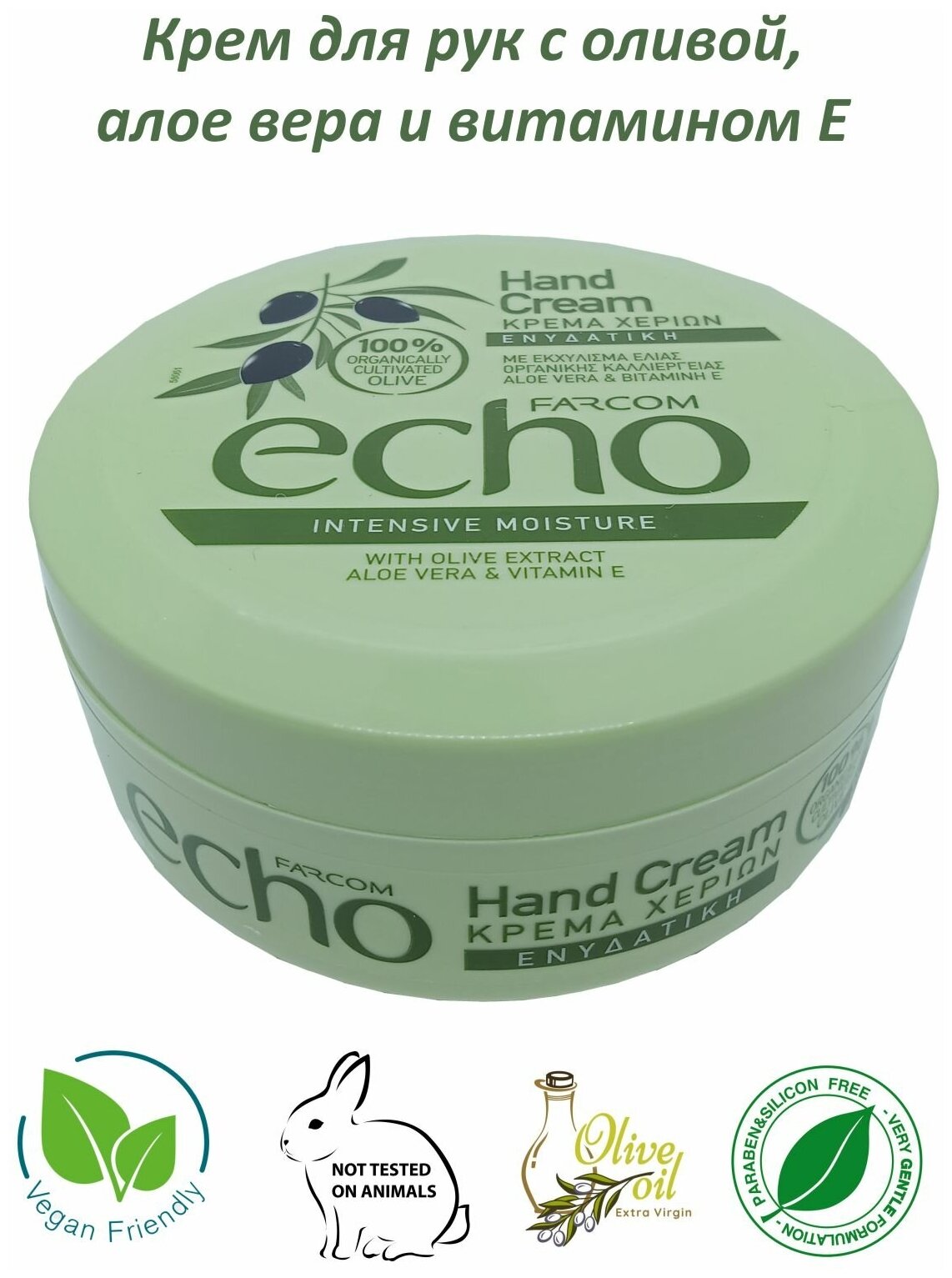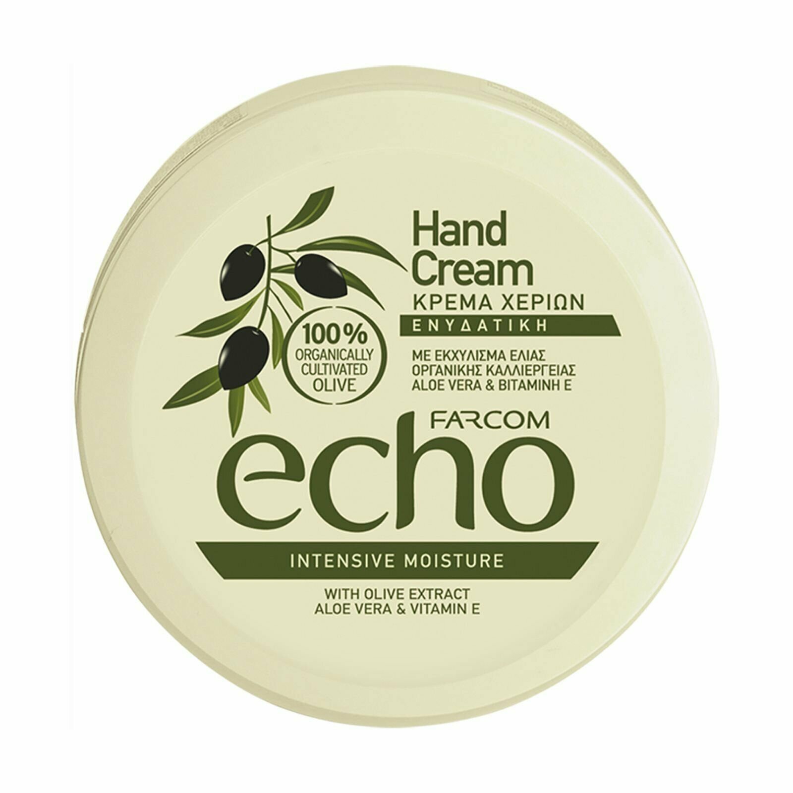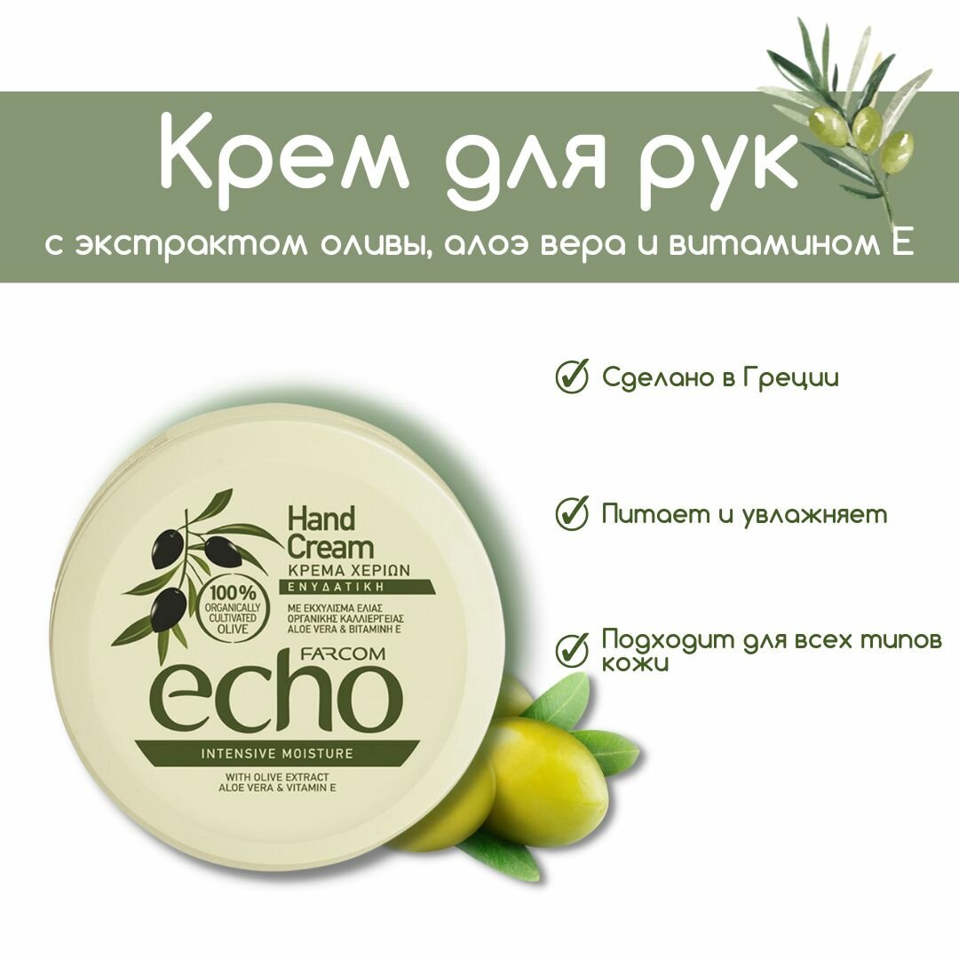 Farcom Крем для рук ECHO увлажняющий с экстрактом оливы, алоэ вера и витамином E, Греция, пл. банка 200 мл