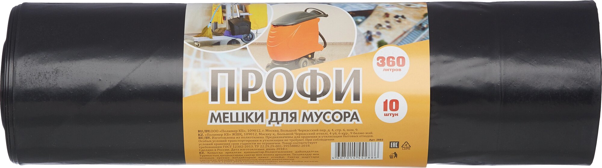 Мешки д/мусора 360л, черные, в рулоне 10шт, ПВД, 65мкм, 110х140см, особо прочные, КБ "Профи", шк2886