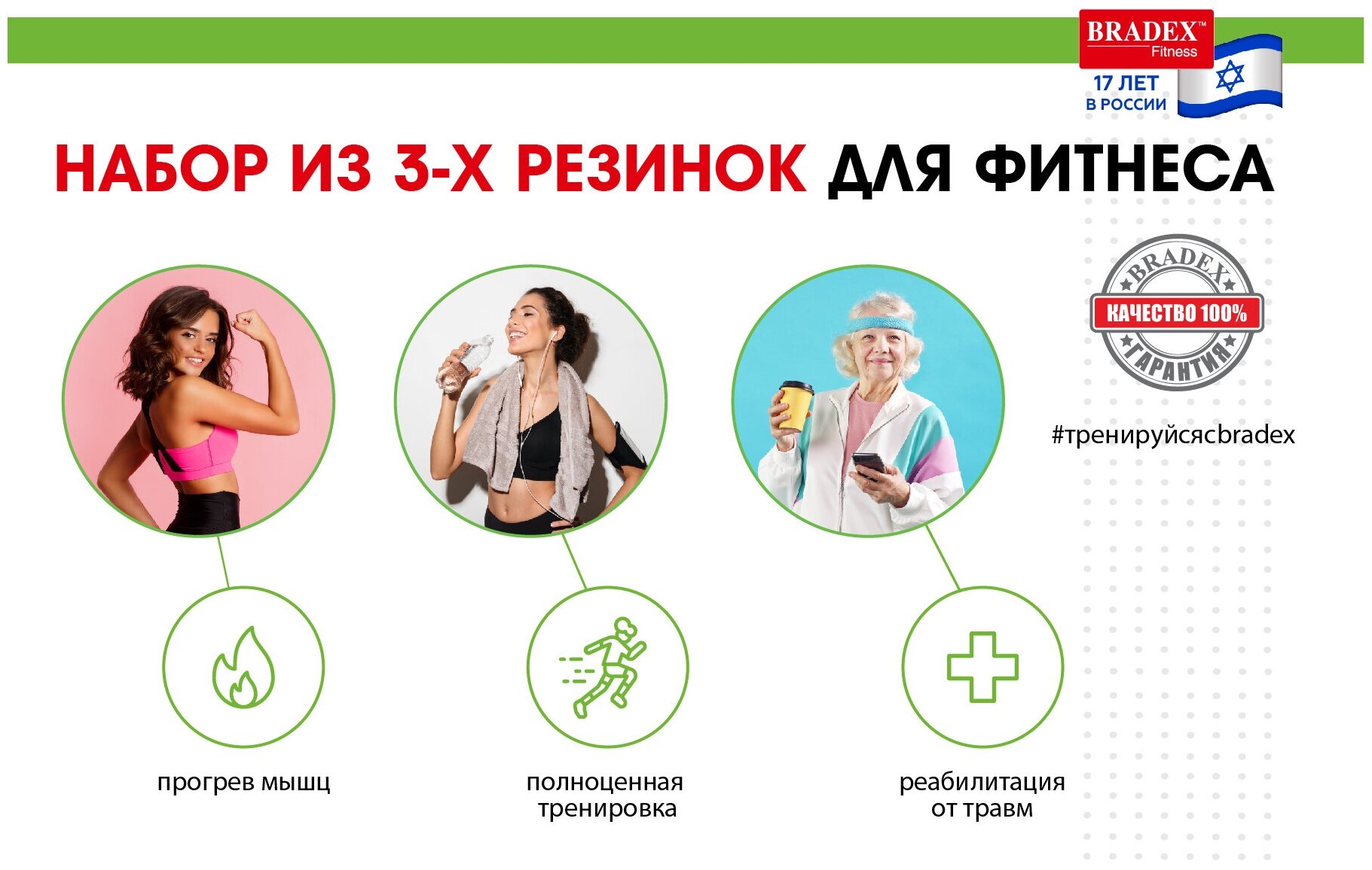 Резинки для фитнеса BRADEX, эластичная лента, эспандер ленточный, набор из 3 штук, нагрузка 4 кг, 5,5 кг, 7 кг