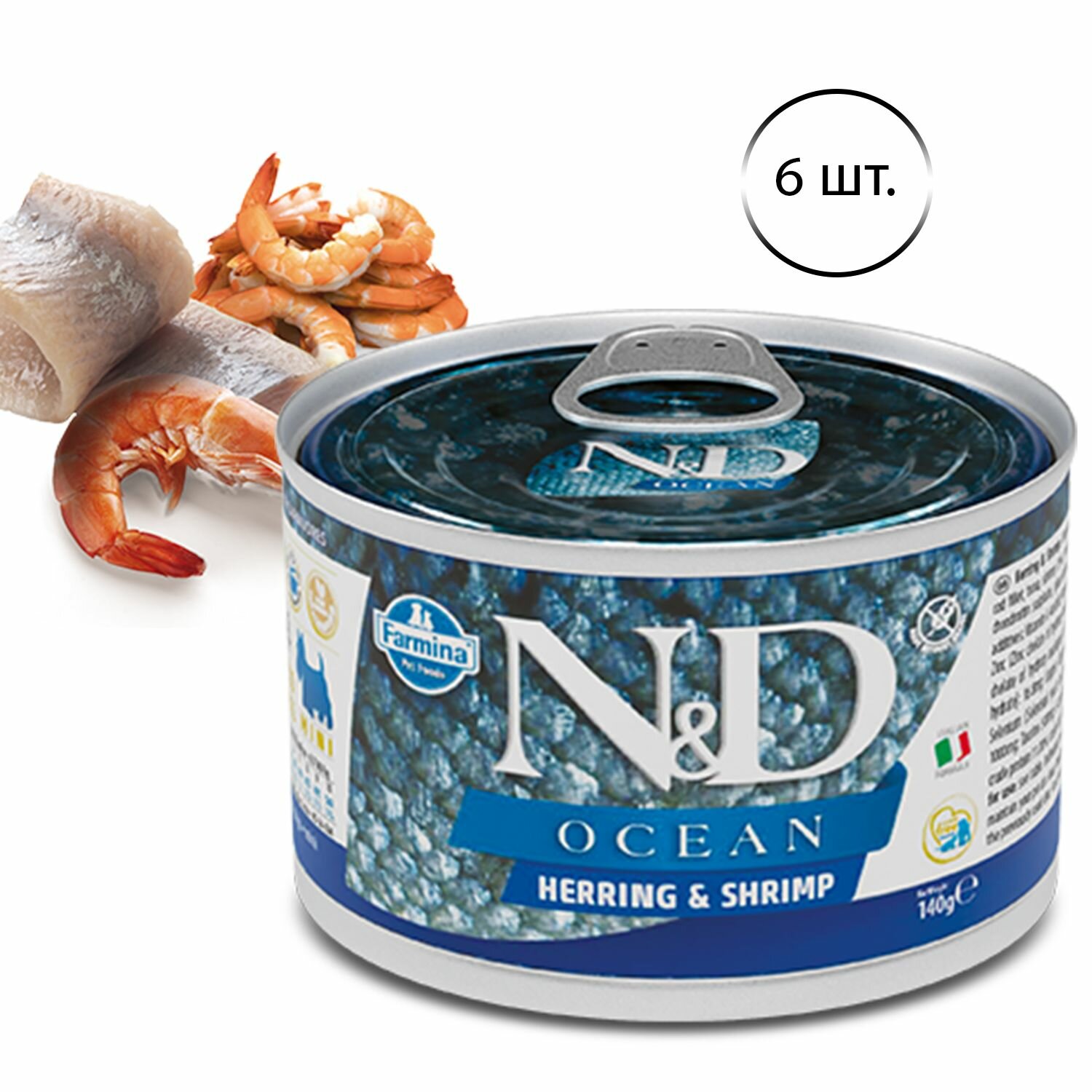 Влажный корм Farmina N&D Ocean для взрослых и пожилых собак маленьких мелких мини пород, Фармина НД низкозерновой рацион со вкусом сельди и креветки, 6шт по 140г