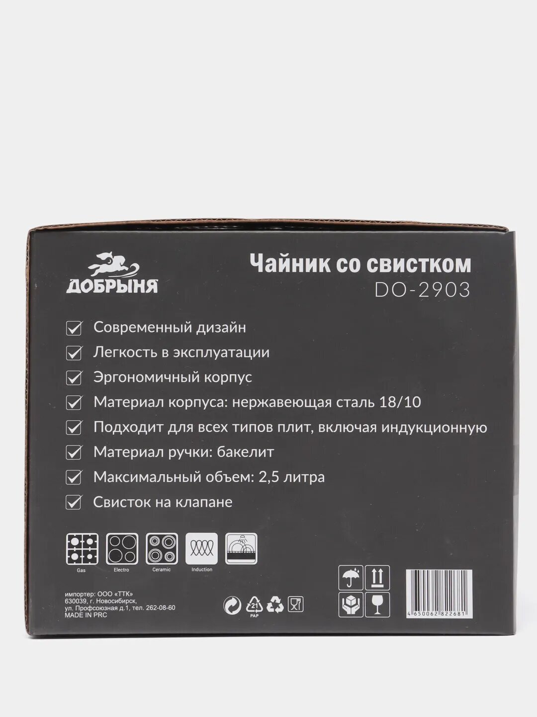 Чайник для плиты со свистком нержавеющая сталь 2.5 л добрыня DO-2903, для всех плит