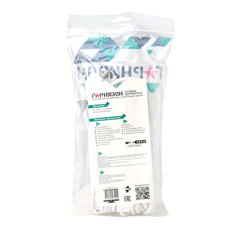 Удлинитель Гарнизон EL-NL3-W-2 3 розетки допустимый ток 10А длина 2м