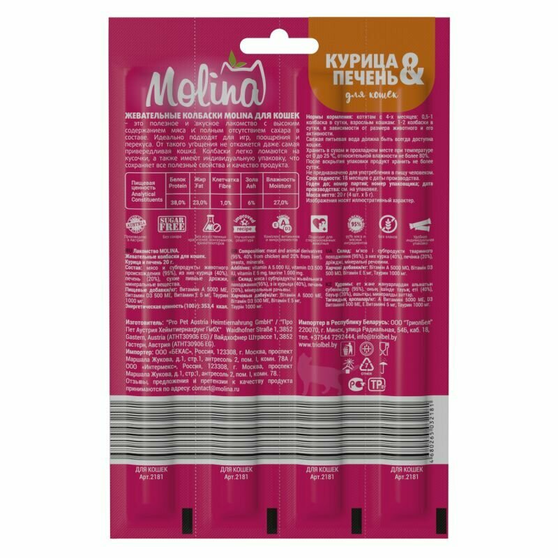 Лакомство для кошек Молина Жевательные колбаски Курица и печень, 5г х 4шт. в уп. 20 г