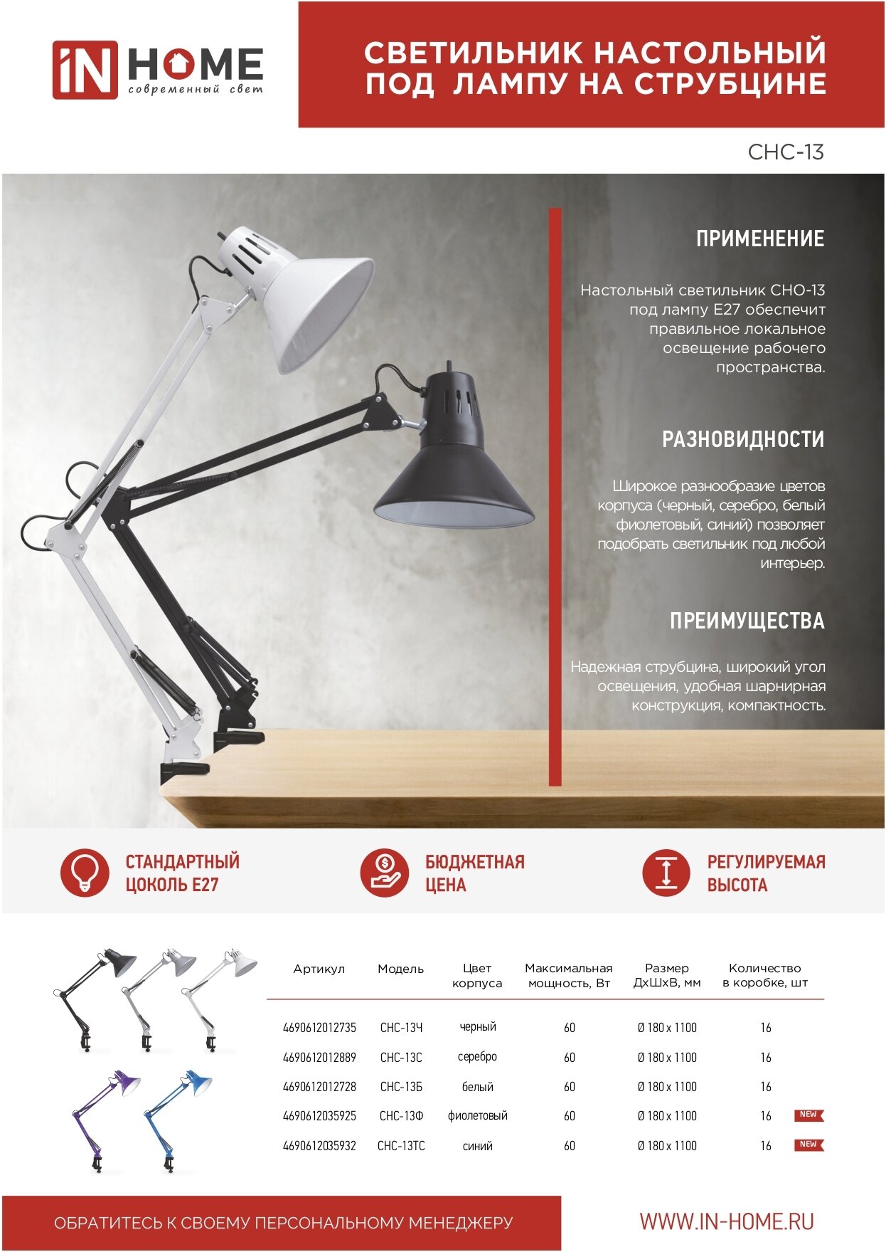Лампа офисная IN HOME СНС-13Б, E27, 60 Вт, белый 4690612012728