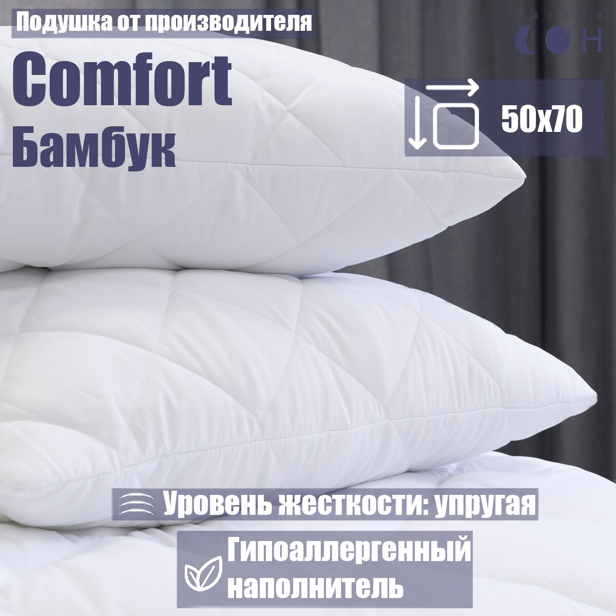 Подушка Мягкий сон Бамбук Comfort, 70 x 70, гипоаллергенная, упругость