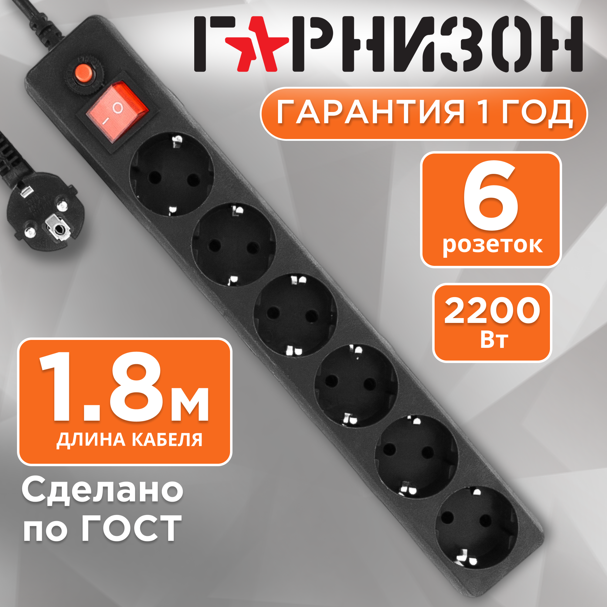 Сетевой фильтр Гарнизон ЕНВ6 - 6 розеток чёрный, 1,8 метра