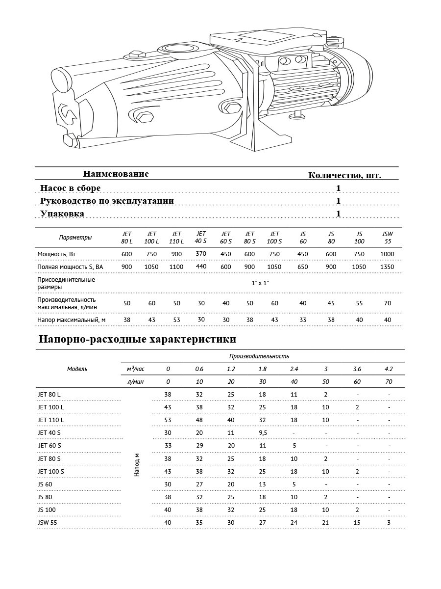 Насос поверхностный JET 80 L (м-ть 0,6кВт, пр-ть 0-50 л/мин, макс. напор 38м)