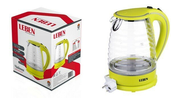 Чайник электрический 1,7л, 1850Вт, скрытый нагр.элемент, стекло, рифлёное стекло, LEBEN