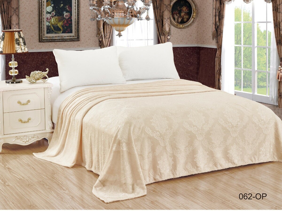 Плед двуспальный евро 200х220 песочный беж, покрывало на кровать и диван Cleo Parma, пушистый с рисунком, велсофт