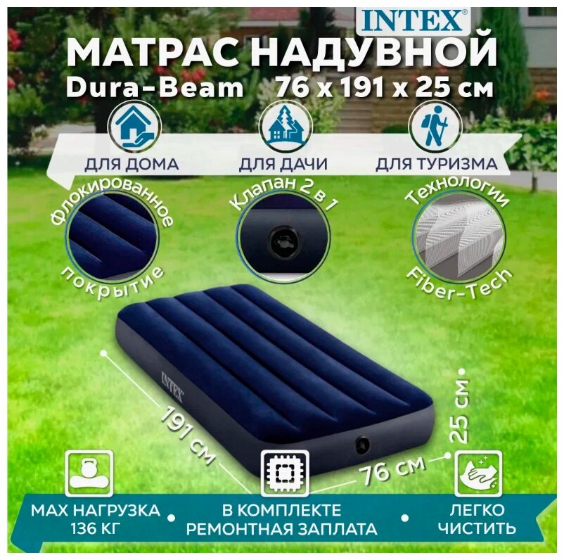 Матрас надувной Intex, 191х76х25 см, 64756, флокированный, 136 кг