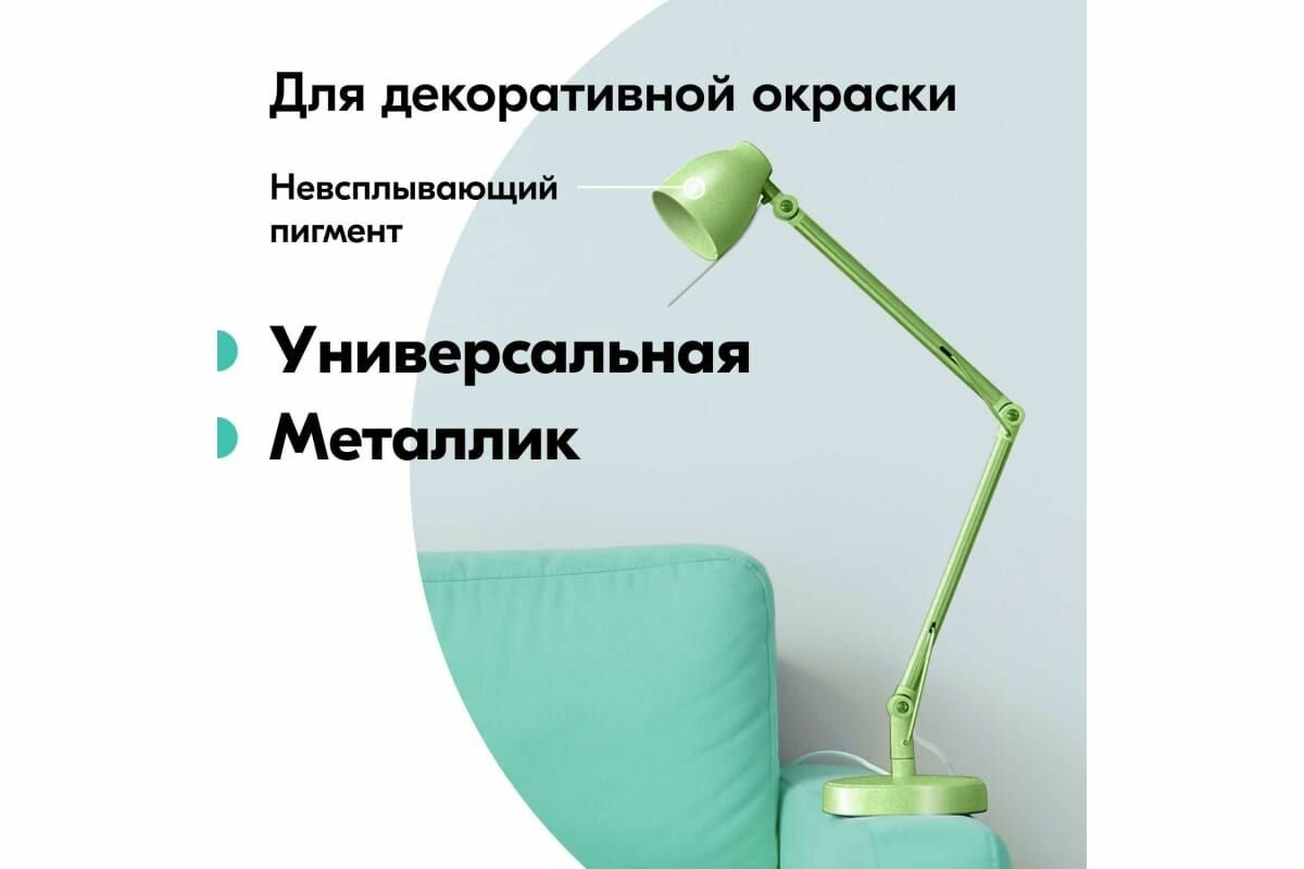 Отличная эмаль, равномерное нанесение, спрей. Универсальная. Недостатки: Красить только на улице или в подъезде. Так как разлетаются серебристые частички на большое расстояние вокруг, и помещение покроется серебристым налетом. Даже паперкрафт-картон покрасили. |