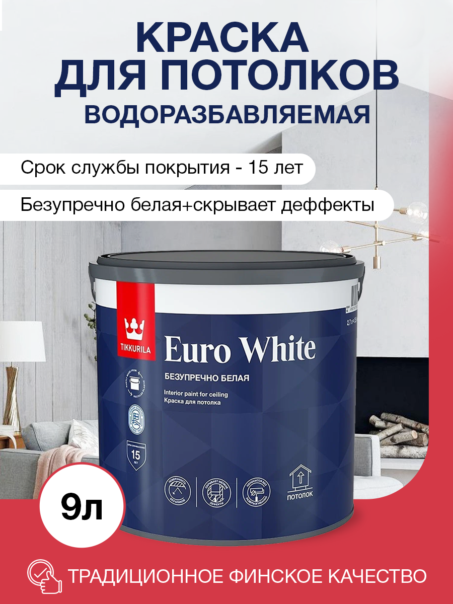 Tikkurila Euro White / Тиккурила евро вайт краска для потолков 9л