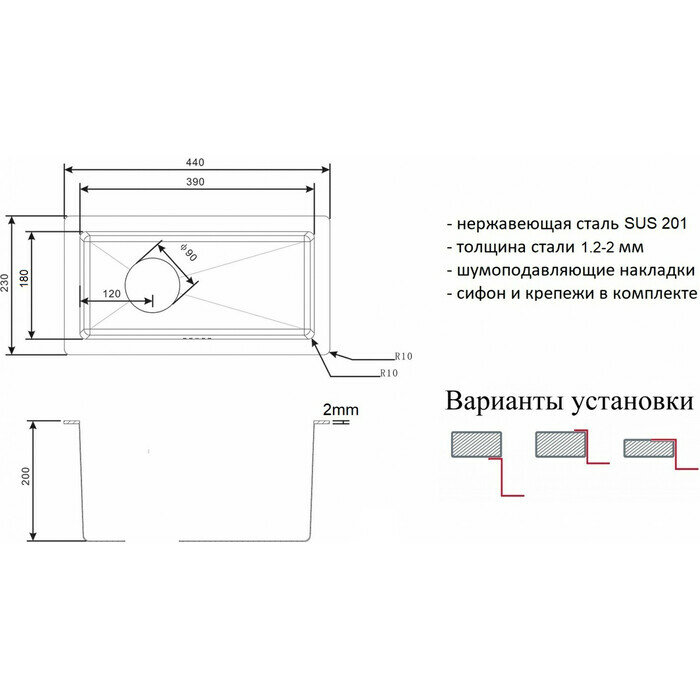Мойка ZorG ZL R 230440 нержавеющая сталь, дополнительная чаша, матовая, толщина 1,2 мм