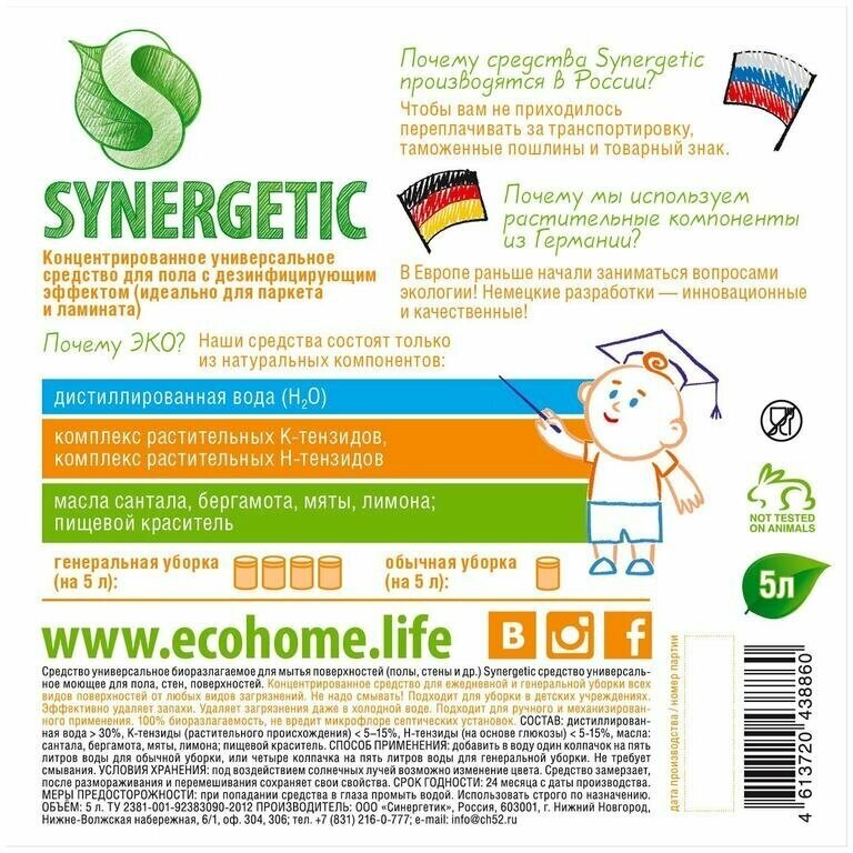Средство для мытья полов, стен и поверхностей Synergetic, 5 л